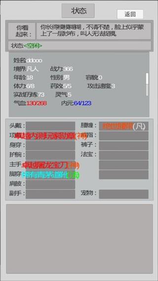 随着挑战的不断深入玩家的角色修为等级也会逐步的提升,设计了简单的文字游戏风格,为玩家构建起来了一个庞大的修真世界,通过简单的操作玩法深入到不同的地点中进行冒险。