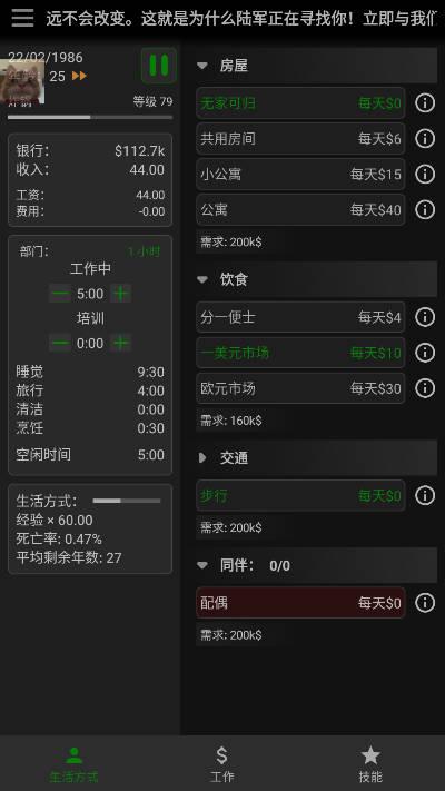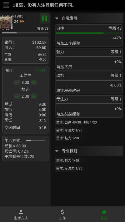一种正常的放置生活内置菜单修改版(it.paranoidsquirrels.beyond_idle)是一款非常好玩的文字模拟人生的游戏,在这里面体验真实的人生,你可以打造属于你自己的生活方式,非常有趣的挑战,提升你的个人技能等!