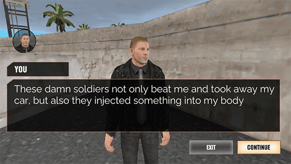 1、进入游戏,剧情介绍说你被该死的士兵不仅打了我,抢走了我的车,还在我体内注射了一些东西。幸好发现了,因此,你现在需要逃离这个地方。