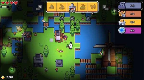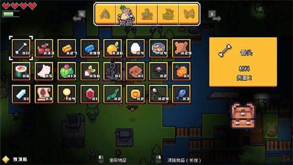 浮岛物语游戏界面的左上角的绿色长条表示角色当前的饥饿值,红色爱心表示角色当前的健康值