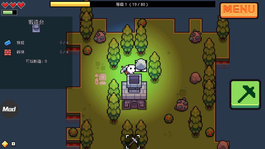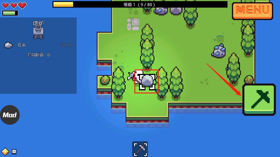 5、然后回到刚开始的页面,开始寻找熔炉的配方——石头;走到石头的旁边,点击右边的锄头按钮;