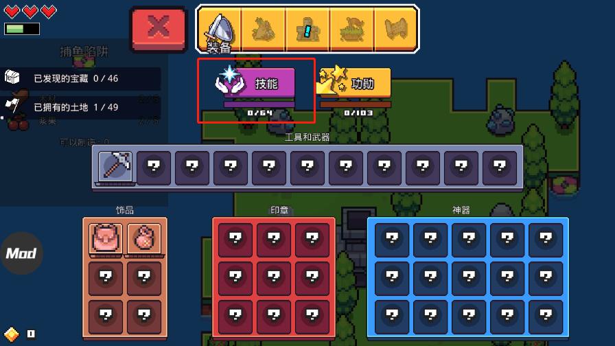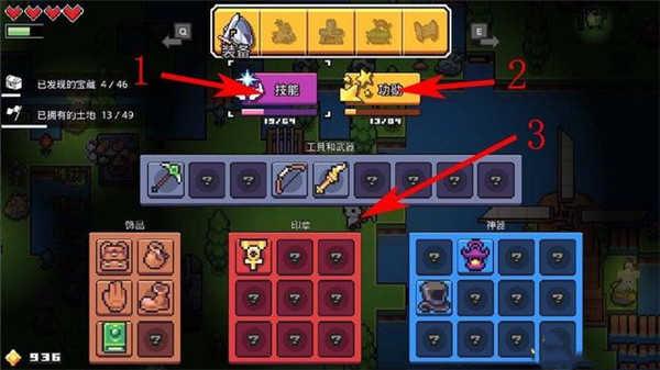 点击菜单栏中的“装备”按钮,可打开装备界面,此处将展示已经解锁的工具、武器、饰品、印章及神器