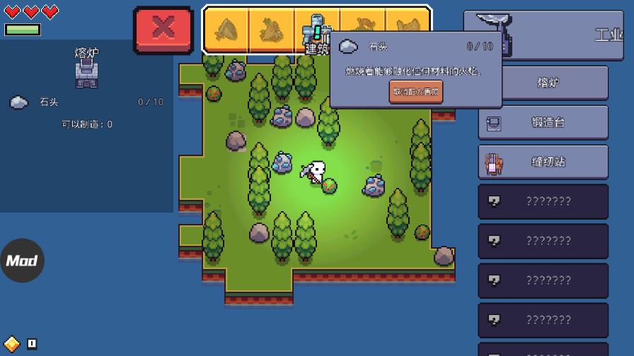 6、当石头都收集完成的时候,就可以建造熔炉,点击右上角的菜单,然后点击建筑,选择好熔炉需要放置的位置,点击【√】即可;
