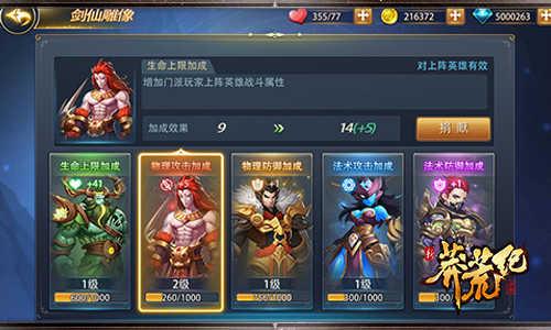 道藏殿的捐献可解锁门派副本的等级;剑仙雕像的捐献可提升门派玩家上阵英雄的战斗属性,包括生命上限、物理攻击、物理防御、法术攻击和法术防御,加成效果则根据捐献的程度来决定;大厅的捐献可增添门派容纳的人数;宴会厅的捐献可提升每日领取的体力加成;祭坛的捐献可增添门派福利的领取次数。