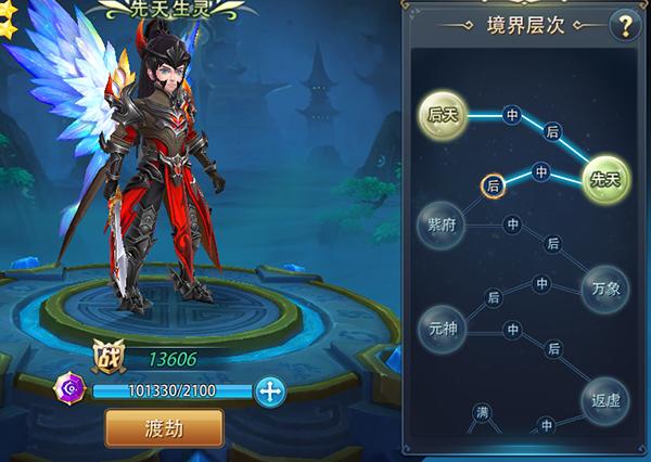 每个主角都有自己的境界,通关困难副本获得神识,提升境界等级,达到规定数值后,可以突破境界,当达到固定等级后,需要渡劫战斗,战斗胜利后,境界继续提升;可以获得额外属性,增加全员战斗力