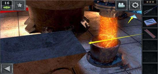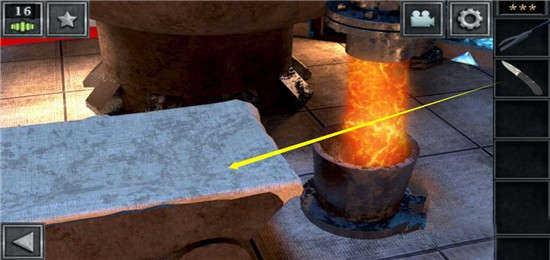 首先点击下方场景中地上的两个道具,得到一个长钳子、一把匕首,然后再点击熔炉的槽口。