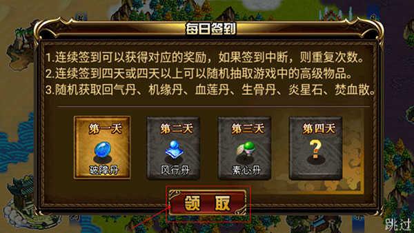 3、进入游戏第一天签到可以领取一个“破障丹”,后面签到可以随机获取回气丹、机缘丹、血莲丹、生骨丹、炎星石、焚血散等;