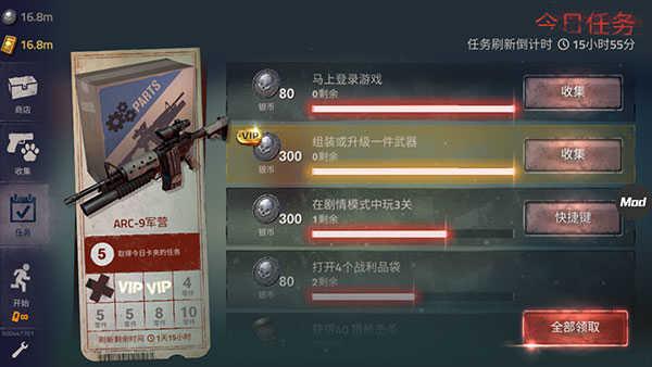 整个游戏最良心的地方。完成给金银币、零件,完成七个又送金,请尽量把所有奖励拿到手,即使是你不喜欢的枪的零件,如果集满了就不会出现了不是吗,就像这样(虽然没满)