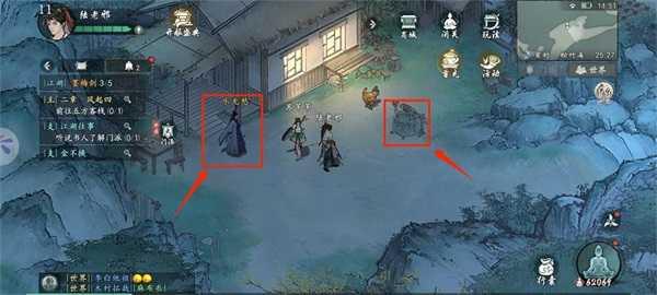 当我们在这里见到大黄哥,往左上走到红框位置,就会跳上屋顶,在屋顶上跟大黄哥对话,会获得一本蓝色轻功。再往前走一点捡到锦袋,然后我们看到屋顶上有个靴子的图标,点图标跳下来即可。