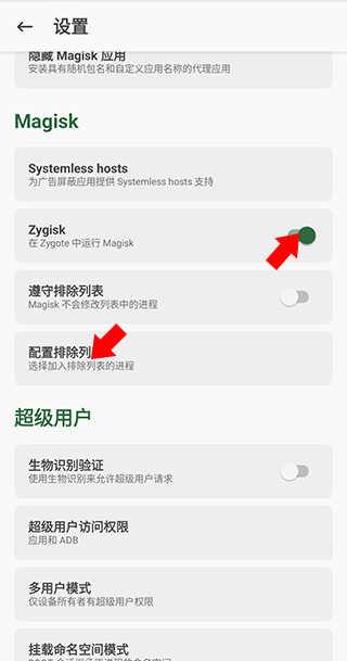 3、来到设置界面后往下滑,找到Zygisk选项,并点击后方的按钮将其开启,接着点击配置排除列表