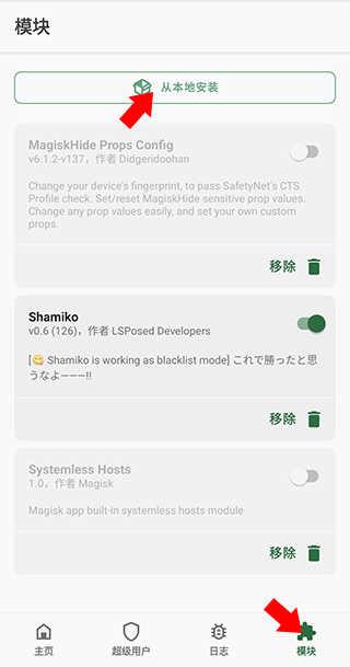 1、首先需要我们安装Shamiko模块,下载Shamiko模块压缩包,打开Magisk后点击下方的模块界面,并点击上方的从本地安装再找到Shamiko即可完成安装(安装完成后需重启手机)