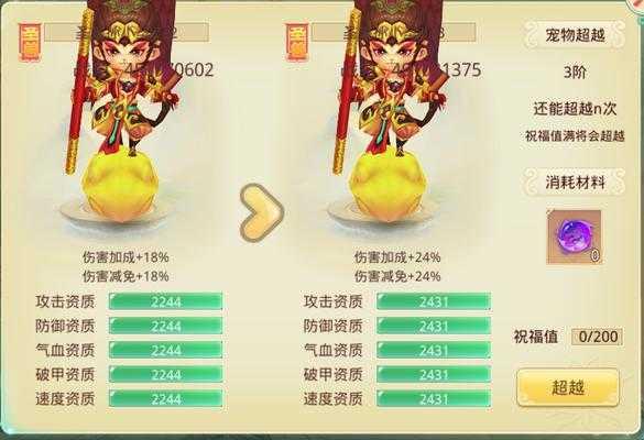 宠物能够大幅提升宠物的基础资质、伤害加成、伤害减免等,宠物资质越高宠物的加成就越高同样的伤害加成越高打出去的伤害就越高,伤害减免是减免伤害的。神兽以上的宠物可以超越,宠物超越第一次是100个对应元神,之后都是是200个,神兽超越是限制10次、仙兽的超越是限制20次、圣兽不限制次数。