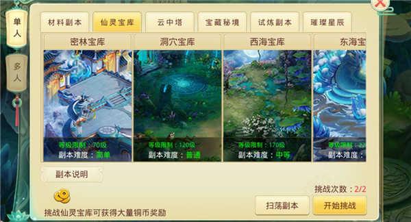 1、仙灵宝库副本,玩家可以在次副本获得大量的铜币,铜币用于提升技能等级和练体等级;