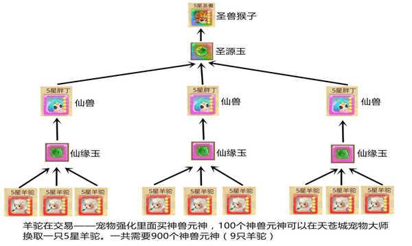 有了圣源玉和仙源玉,就可以合成圣兽猴子了。一共需要 900 个神兽元神(交易市场),3 个仙源玉(活动有送,一战也送),1 个圣源玉。在右下角点合成——宠物合成——神兽合成。