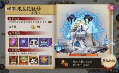 鬼灵花魁为逢魔之时召唤首领。4月29日更新维护后,从町中-逢魔之时灯笼进入现世地图后,点击寻找首领按钮即可参与集结。