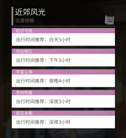 答案很简单,点击出游选项,选择出游地点,每个地点右下角均有一个小小的书本形状,点击即可看到对应的出游攻略。