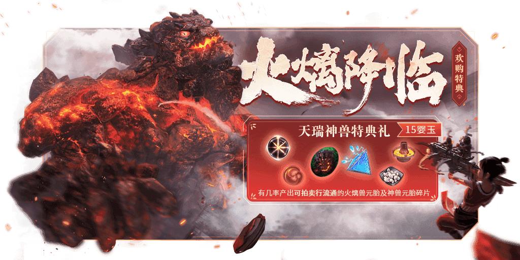 l 火㷰降临,神兽归位:伴随着火㷰兽加入神兽队列,商城同期上新常驻礼包【天瑞神兽特典礼】,售价仅15婴玉,打开即有机会获得超值道具:包括勾玉、各类宠物养成道具,甚至有机会获得神兽元胎碎片与火㷰兽元胎(小概率获得),并且碎片与元胎均可在拍卖行中流通!