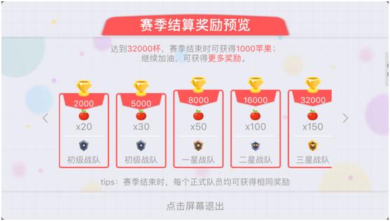现在的你,除了可以从排位赛获得大量赛季结算奖励之外,还可以参与战队比拼,获得丰厚的日常奖励和赛季结算奖励,达到2000个奖杯的战队每位正式成员能够获得大量苹果奖励,每个战队奖杯贡献量前三的队员还会挂在战队贡献榜中,战队荣耀成员共享!