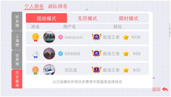为了提升更多玩家上榜的可能性,增加排行榜的互动性和炫耀性,最新版本的榜单增加了地区榜、历史最高、战队榜等,说不定哪天上榜的就有你哦。