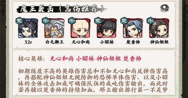 核心英雄:无心和尚、小昭妹、神仙姐姐、楚香帅。初期练度不高的英雄伤害总和不如无心和尚反弹伤害高,再搭配神仙姐姐无视防御的恐怖单体伤害、以及小昭妹的全体攻击加成可确保队伍的成吨伤害输出,而此时若再辅以楚香帅的持续加血,那么输出排行第一不是梦。