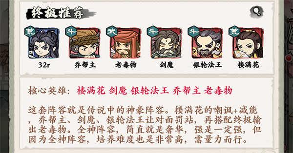 核心英雄:楼满花、剑魔、银轮法王、乔帮主、老毒物。这套阵容就是传说中的神豪阵容。楼满花的嘲讽+减能,乔帮主、剑魔、银轮法王让对面罚站,再搭配终极输出老毒物。全神阵容,简直就是奢华,强是一定强,但因为全神阵容,培养难度也是非常高,需量力而行。