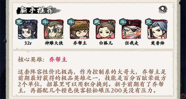 核心英雄:乔帮主。这套阵容性价比极高,作为控制系的大哥大,乔帮主是前期最好获得的极品英雄之一,技能是百分百眩晕敌方2个单位,招募里可以用积分换到。新手前期有了乔帮主,再搭配几个橙色侠客轻松碾压200关没有压力。