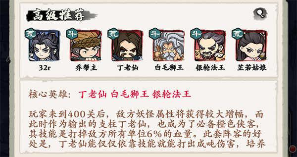 核心英雄:丁老仙、白毛狮王、银轮法王。玩家来到400关后,敌方妖怪属性将获得较大增幅,而此时作为输出的支柱丁老仙,也成为了自创武林游戏里必备的橙色侠客,其技能是打掉敌方所有单位6%的血量。此套阵容的好处是,丁老仙能仅仅依靠技能就能打出成吨伤害,培养成本极低,此套阵容难点在于白毛狮王、银轮法王的获取难度较大,丁老仙可以通过招募积分兑换获取。