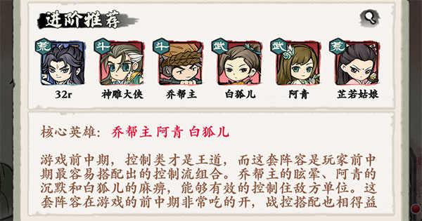 核心英雄:乔帮主、阿青、白狐儿。游戏前中期,控制类才是王道,而这套阵容是玩家前中期最容易搭配出的控制流组合。乔帮主的眩晕、阿青的沉默和白狐儿的麻痹,能够有效的控制住敌方单位。这套阵容在游戏的前中期非常吃的开,战控搭配也相得益彰。在中期比较缺卡的情况下,无疑是首选阵容。