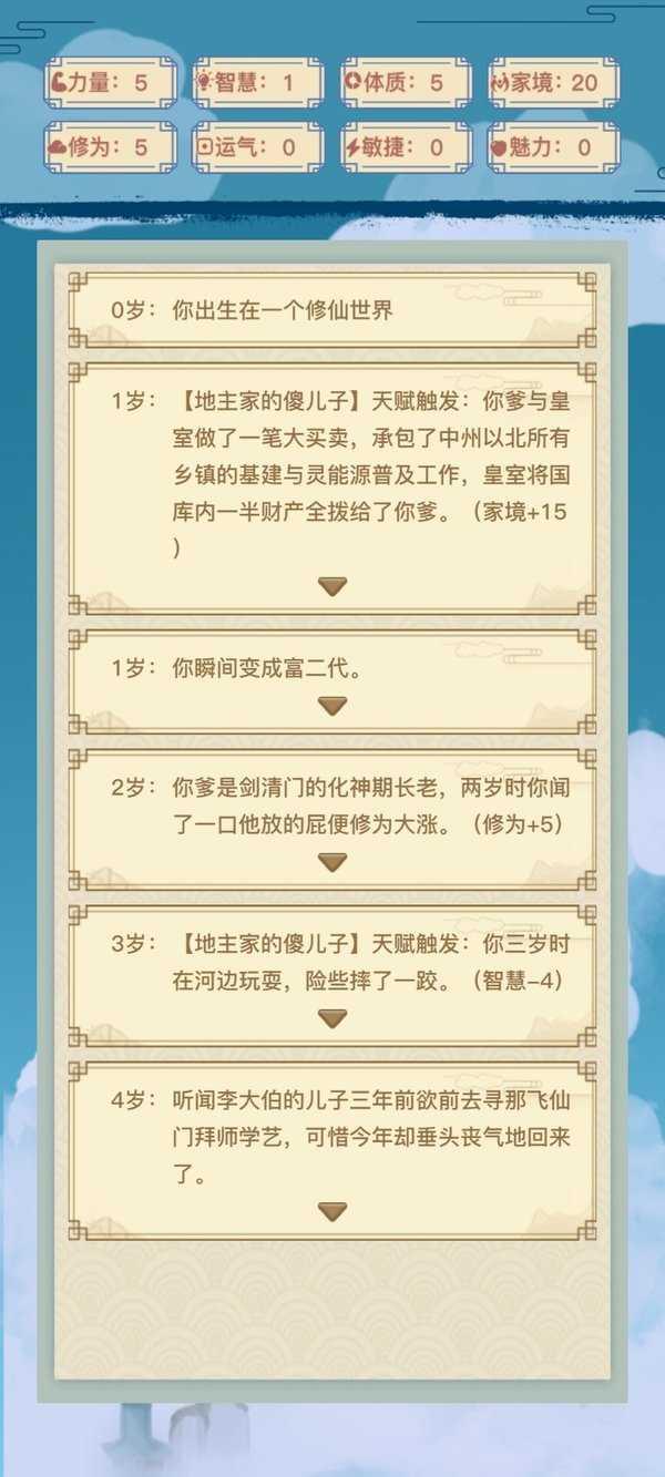 游戏挺好,选项也很丰富,就是交代背景以后能不能别占一年,毕竟交代少的时候,八岁就练气了,多了18岁才练气。能和跟修炼有关的事件合并的最好合并一下。然后每一个事件之间的关联貌似太少了,也就天魔之躯那一条线多一点。(我玩了一会儿时间之内)。本来应该最有可玩性的炼丹和炼器等在这个游戏里只是当做配角,甚至只是跑龙套的事件,看来看去也就只有当一名普普通通的修士,像什么炼丹师,炼器师各种各样的职业都是别人家的。