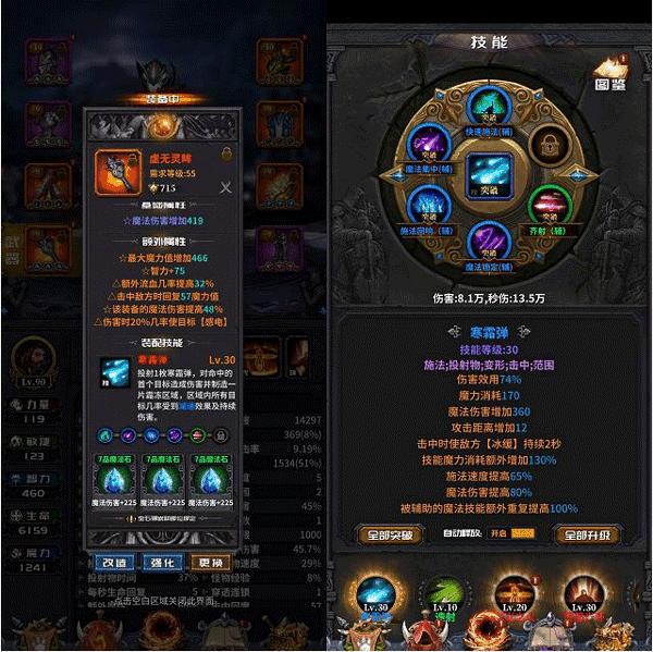 5、50的装备一带,继续推怪,在6-15章节,把前面存的传说地图,神话地图全部打开用掉(前期不要用)在往下个章节接着推怪,推不动了就刷幻境紫图橙图深沙,困难神祈 爆55/75橙装,中间爆了55的橙装看带上去后魔法伤害提高了就带着,没有就接着带紫装。