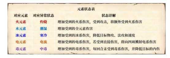 1、元素是目前最被玩家忽视的一点!元素给战斗带来更多丰富性,其中最百搭的是水元素,八大门派里焚香自带灼烧、青云自带电流、万毒自带中毒,其余门派没有元素技能。具体元素效果如下表所示: