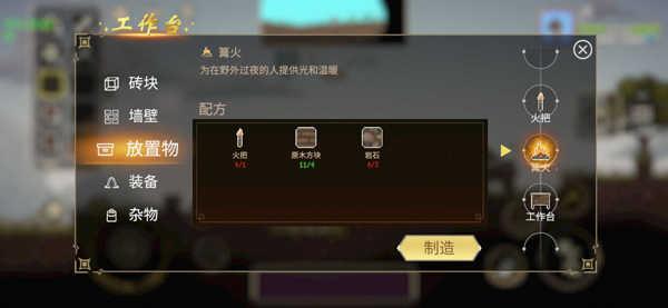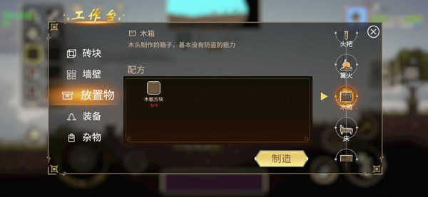 也就是左侧的按钮,点击后可以制作少量物品,就拿“放置物”分类来说,随身工作台只能制作三种放置物。