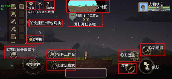 游戏的基本操作是采用鼠标+键盘控制的方式,鼠标左键-使用物品,鼠标右键-采集物品,鼠标滚轮-切换快捷栏,A-向左移动,D-向右移动,W-向上移动,S-向下移动,Space-跳跃,F-交互。除此之外还有一些便于操作的快捷键,具体键位分布可以在游戏主界面-设置-控制中进行查看。