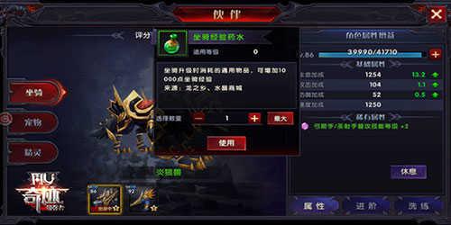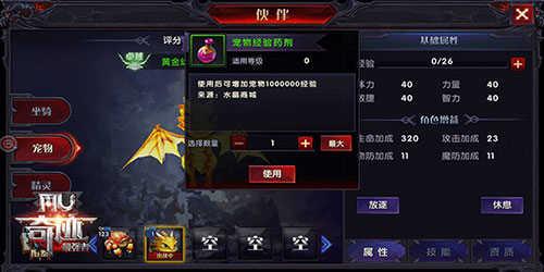 点击右上角,角色属性增益下方经验值加号,可以对坐骑进行升级,升级后可以增加基础属性,并可以在西方查看稀有属性,选择适合个人职业的坐骑。