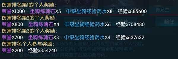 活动结束后分别会对伤害最高的战盟以及个人发放奖励,前五名的战盟分别获得数目不等的银质勋章以及战盟资金,排名前三的个人会获得数目不等的荣誉、坐骑炼魂石、中级坐骑经验药水以及大量经验。而且大家只要参与都会有高额经验以及荣誉拿。荣誉积累可以换取自己喜欢的宠物哦。