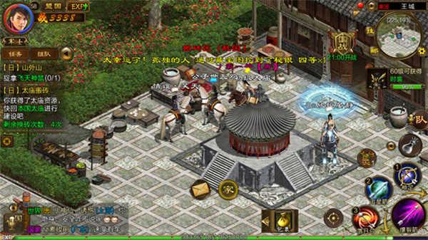4、小木屋躲藏。火力太猛扛不住了怎么办?那就避其锋芒吧!你一定会发现太庙的东北方有一个传送点,没错,那就是传说中的小木屋,你点进去就会传送到小木屋,就会进入安全地带,等待换砖冷却时间,这种办法是最安全而且减少原地银两的方法!
