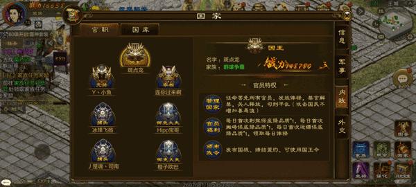 国王:任命罢免所有官员,发放俸禄,禁言解禁,关人释放、司刑平乱(击杀国民不红名);每日可领俸禄,并且首次刺探、搬砖、运镖必定绿色品质;还可以发布国战、缔结盟约、使用国王令,拥有国王称号。