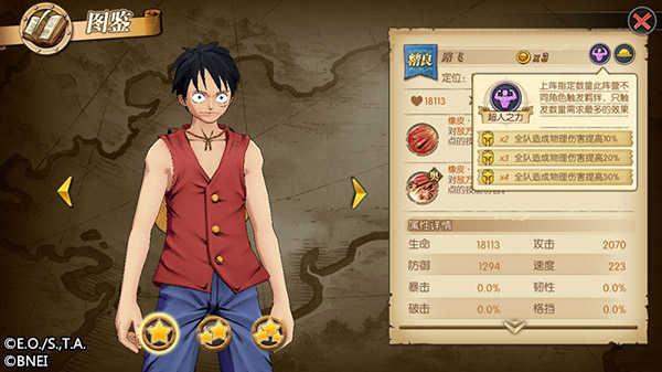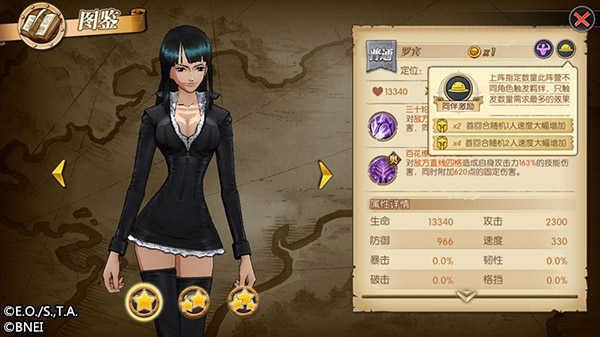 比如罗宾、路飞同属于草帽团阵营,二人同时上阵可触发“同伴激励”效果;罗宾、路飞的果实能力都属于超人系,同时上阵还可触发“超人之力”效果,这两种效果可叠加触发。