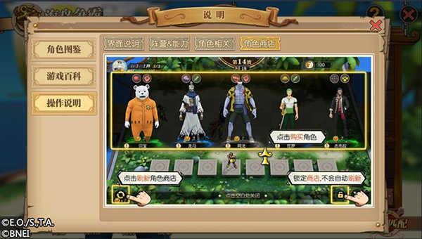角色商店每个回合自动刷新一次,也可以通过消耗2枚金币进行一次刷新。玩家通过点击购买角色,购买后的角色会自动进入备选台,如果遇到出现了心仪的角色但是金币不够的情况,可以使用锁定商店等待下一回合,船长大大们在购买完后一定要记得及时取消锁定哦~