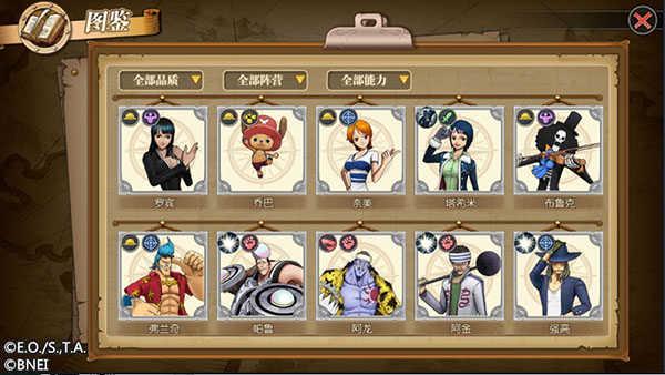 图鉴中的角色分为5种品质,9种阵营,6种能力。每个角色都有着各自的阵营和果实能力,上阵有着相同阵营或者果实能力的角色达到指定数量时,玩家会得到特定的效果加成,可叠加触发。