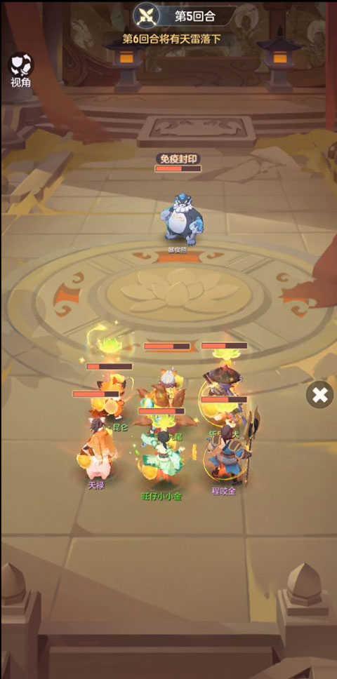 3、第4回合后,前排小花全部清除完毕,专心集火暴食熊,普陀持续为队友恢复血量,避免被第六回合末的天雷直接带走,坚持到最后就可以通关了。