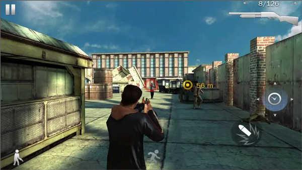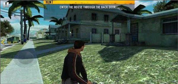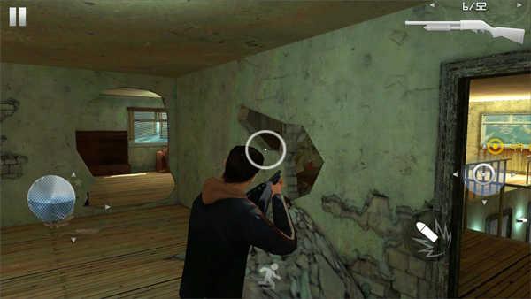 7、在游戏屏幕的左下方有一个小人拿着枪的样子,那个是可以转换人物的状态的,主要就是站着或者是蹲着的切换。这个在进行躲避敌人的伤害的时候非常的有用。同时玩家可以看到下图有一个黄色的光圈,那个是玩家可以完成任务的地方,比如爬窗或者是踹门等等。