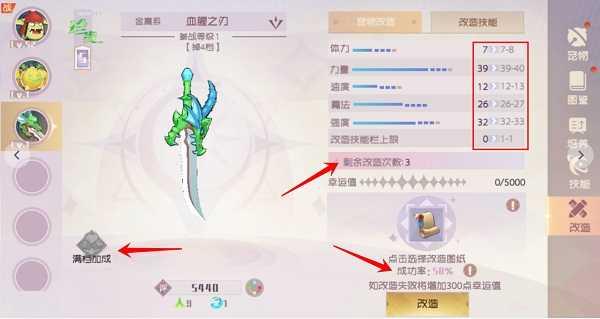 2、我们可以看出,首先选自己心仪的宠物,点击选择改造图纸,这时候会显示改造成功率,改造成功就会如图中所显示的,在宠物基础属性上进行增强;但是改造失败的话,也会增加幸运值,当幸运值到最大化时,改造会百分百的成功!