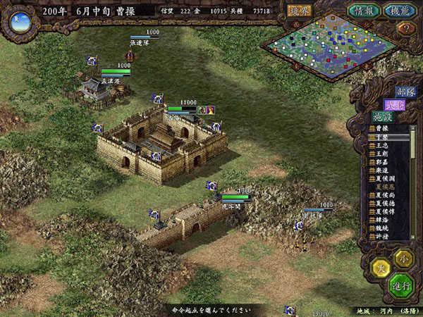 拿下城以后,要记得——千万不要修城防!城防越低越好,低到只有1最好,修城防笔者通常是在接近统一而又打算打出Good Ending时才会做的事情。电脑反扑时以冲车发石之类攻城阵型以己方据点为目标撤退,当然不走远,就在城边上呆着,待电脑占领城后,下回合立即攻城又把城拿下来,兵力和俘虏武将都可以毫不费力地大幅度增加。港口和关可以依此类推。实在要搞内政建设的话,开垦和商业只做一样足矣,历代三国志都有的炒粮大法可以保证你专攻一项就可以完全满足需要,鉴于收获只有七月才有一次,笔者更倾向于做商业,至于民心,因为关系的是兵役人口增加量,而有了上面提到的空城骗兵大法,San9又有伤兵恢复的设定,兵力的来源基本不是什么问题。还是那句话,全面内政那是在接近统一而你又想打出Good Ending时才做的事情。有武将闲着的话,探索再探索就是。