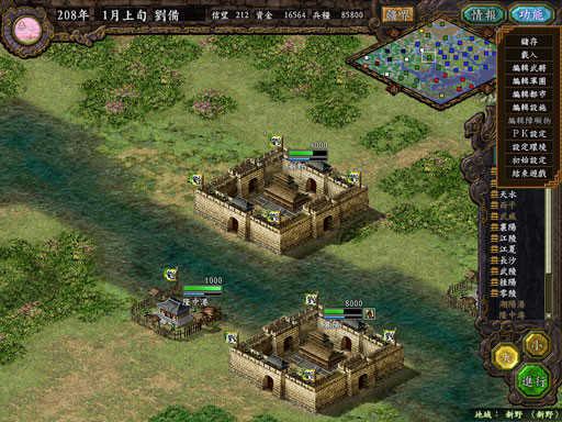 终于最担心的事情发生了,刘表在曹操的流言之下关系变成险恶,攻下了襄阳边上无人防守的隆中港。接下来大军从隆中直扑新野。这个时候该征兵了,也不用多征,全国兵力有个15000就行。敌取新野必先取湖阳港,敌重我寡绝不可死守。人家孙权挡曹操不就靠这长江天堑吗,我可不能放着长江这个好帮手不用,先用把全国之兵送到湖阳,再伪报之计让刘表来回跑上三四趟,连我的边都没碰到士气已经降到50,同时把全部大将、军师调到湖阳港。现在发家的时候到了!让关羽率领水军优秀的将领--甘宁、周仓、诸葛亮、徐庶等带12000人乘楼船发起反攻,刘表的走舸在楼船面前不堪一击,两万人顷刻间灰飞湮灭。关羽楼船趁热打铁攻下隆中港,总共才损了2000不到。这个时候襄阳城里的兵剩下一万七了,从隆中攻城我未必攻的下,可襄阳这个肥城是我梦寐以求的,现在是最好的机会,我绝不能放过。把湖阳的3000人调到隆中,让关羽等率领的楼船10000人进军湖阳,选择遇敌攻击。在隆中和湖阳之间的长江上,关羽楼船射程刚刚好够的着襄阳,楼船对城市的攻击力发扬的淋漓尽致。不靠岸的来回穿梭几次之后,襄阳城里的守军在楼船的兵法攻击下损失殆尽,这个时候张飞率领隆中的3000精兵攻入了襄阳。刘备终于有了安身立命的基业。