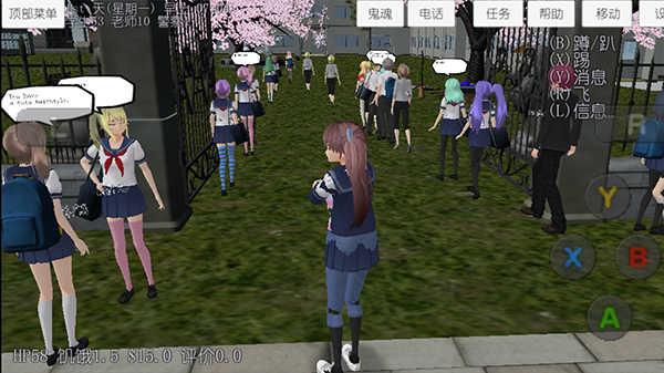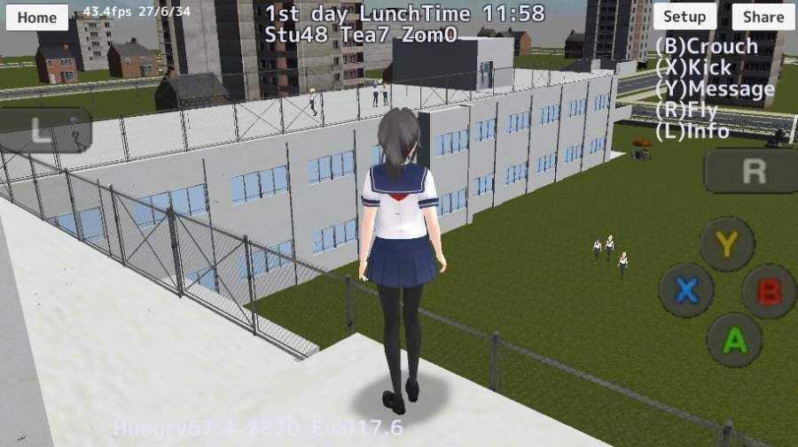 玩法:很普通的玩法,无僵尸模式,照着课表上课,吃东西,上社团活动,加入或退出社团,和学生老师互动,攻略学生并和学生恋爱,爬山玩水,开车等。