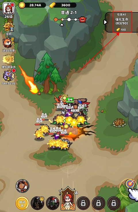 1、游戏以主线冒险为主,角色自动战斗,无需操作,玩家需要点击右上角的任务进行完成,不断提高角色战斗力,通过关卡,解锁更多有趣玩法。