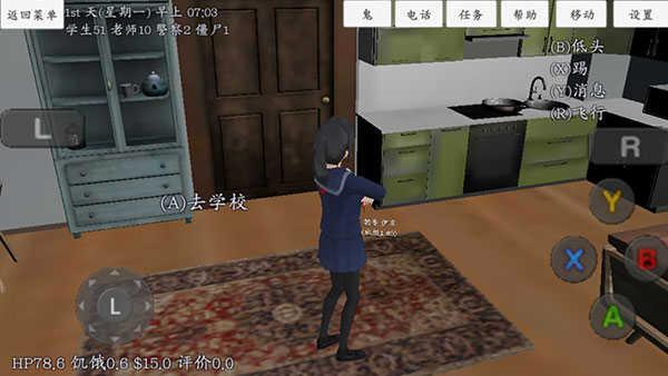 玩法:很普通的玩法,无僵尸模式,照着课表上课,吃东西,上社团活动,加入或退出社团,和学生老师互动,攻略学生并和学生恋爱,爬山玩水,開車,等…… .。