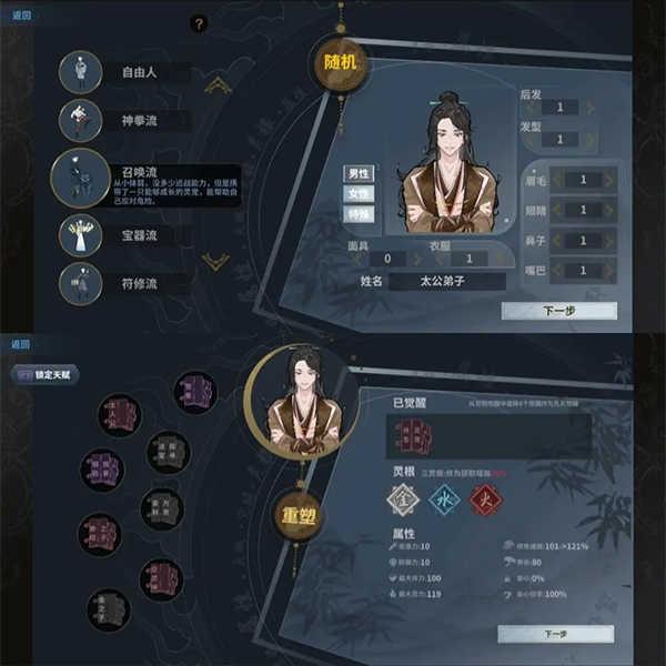1、开局有二个搭配,一个是流派选择,一个是灵根选择,流派要看大家的喜好来选择,适合自己的流派,才是最好的,还可以改变人物形象,灵根是可以点重塑随机改变的,我推荐新手可以去刷单灵根,比较好操作,锁定天赋可以选4个!