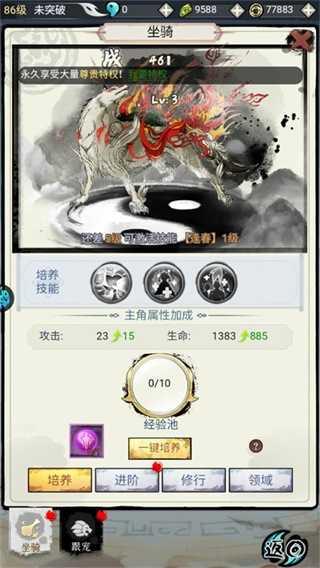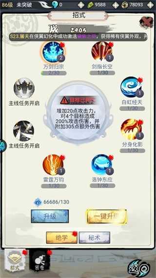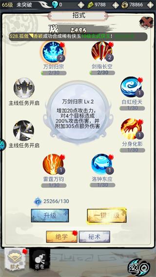 3、只要角色的突破境界达到了一定地步,在加上高等级装备的额外属性加成,就可以轻松的击败后续支线任务当中的敌人。大家也可以在战斗的时候,多利用一些同伴的辅助攻击,给敌人造成更多的伤害,这样就可以更快获得胜利。如果没有同伴的话,角色的战斗技能必须达到四个以上在去挑战。
